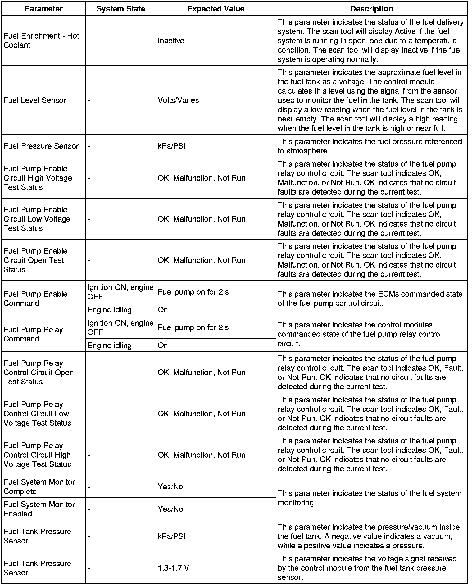 The scan tool values from a properly running engine may be used for comparison with the engine you are diagnosing. The engine scan tool data list represents values that may be seen on a normally running engine.