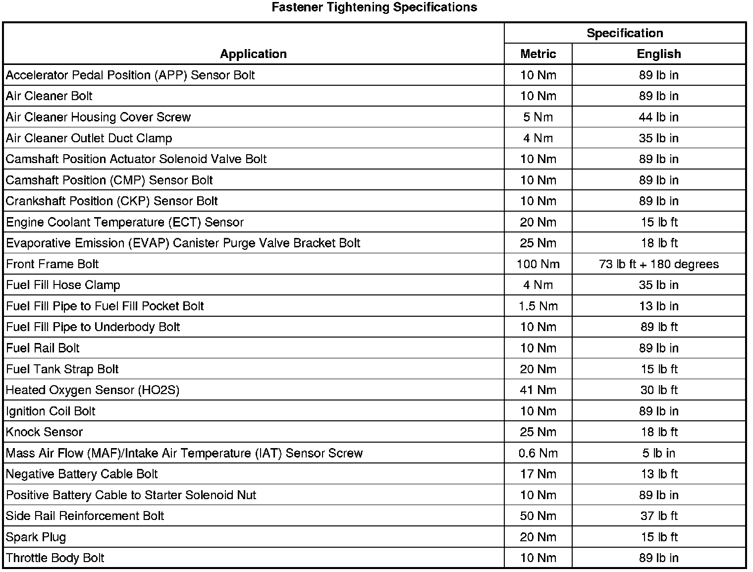 Fastener Tightening Specifications