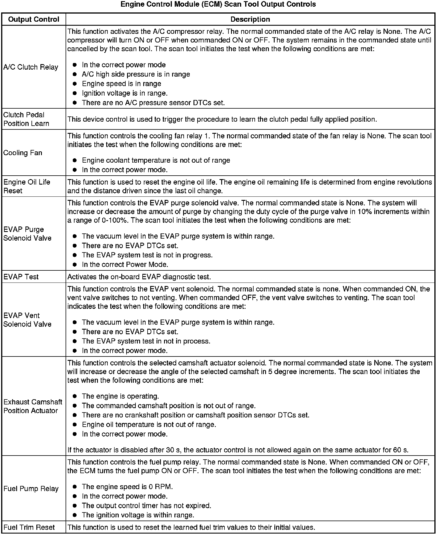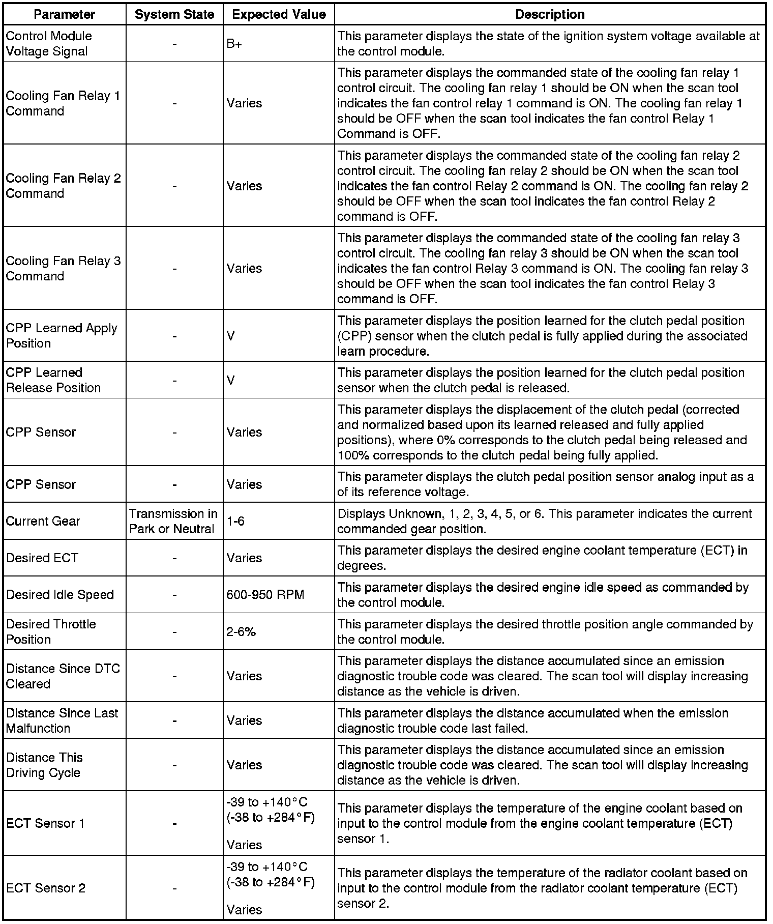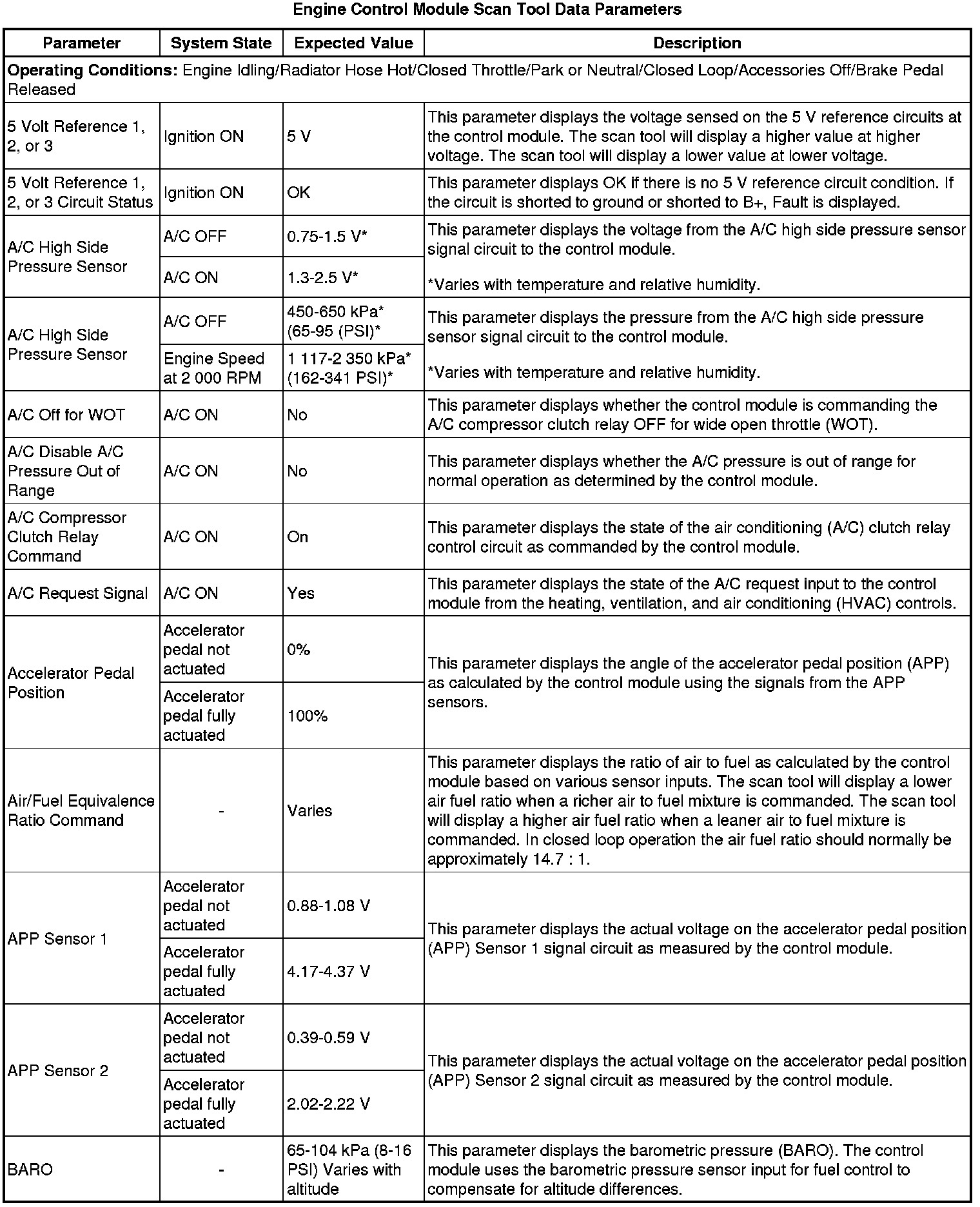 The Engine Control Module Scan Tool Data List contains all engine related parameters that are available on the scan tool. The list is arranged in alphabetical order. A given parameter may appear in any one of the data lists, and in some cases may appear more than once, or in more than one data list in order to group certain related parameters together.