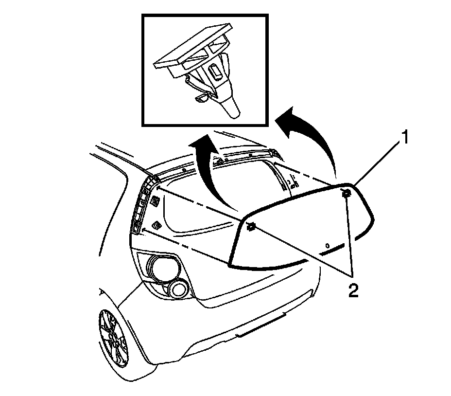 20. With an assistant, align the window locating pins (2) to the slots located in each corner of the pinch-weld flange. Lower the window (1) to touch the auto-adhesive.