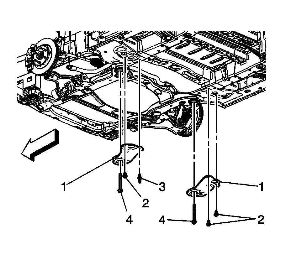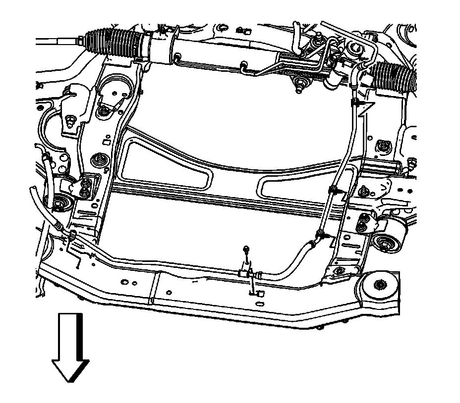 30.Remove the frame insulators from the frame. Refer to Drivetrain and Front Suspension Frame Front Insulator Replacement Service and Repair and Drivetrain and Front Suspension Frame Rear Insulator Replacement Service and Repair .