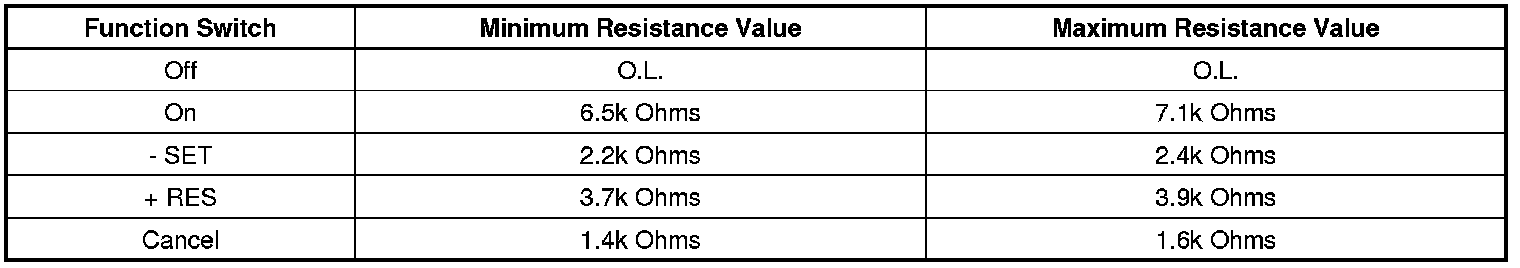 2. Cruise control switch ON, measure the resistance between terminal 1 and terminal 3 while individually activating and holding each cruise control function switch and compare the resistance reading to the values in the table below.