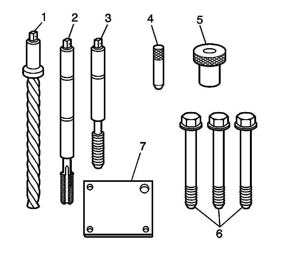 The crankshaft main bearing bolt hole thread repair tooling are in the kits EN 42385-2000 - insert kit and EN 42385-700 - kit. The crankshaft main bearing bolt hole thread repair components consist of the following: