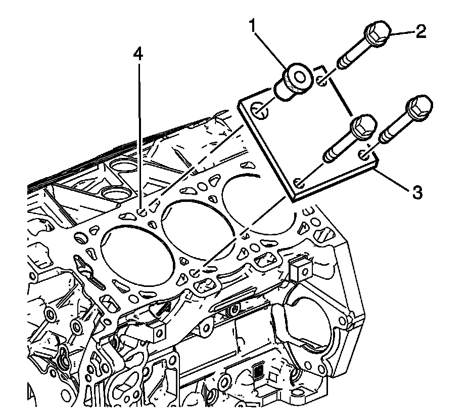 1. Position the fixture plate (3) with the bushing (1) installed over the crankshaft main cap bolt hole to be repaired.