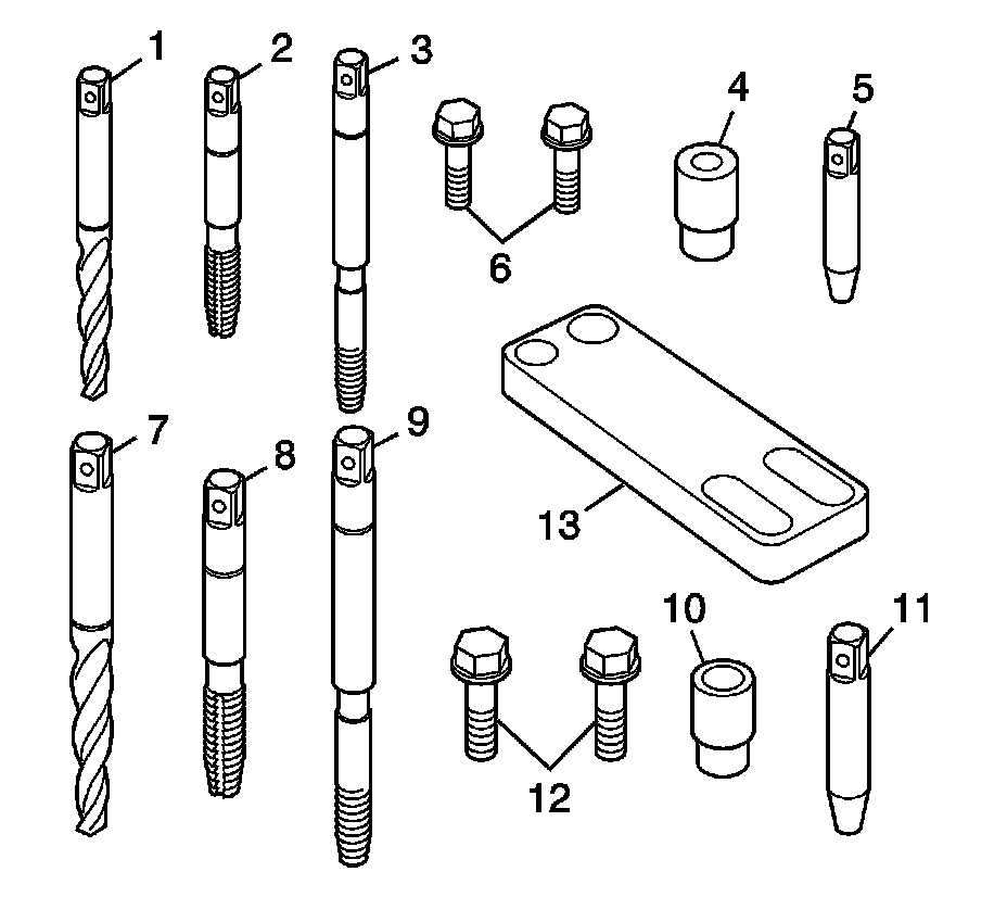 The cylinder head bolt hole thread repair tooling are in the kits EN 42385-2000 - insert kit and EN 42385-700 - kit. The cylinder head bolt hole thread repair components consist of the following: