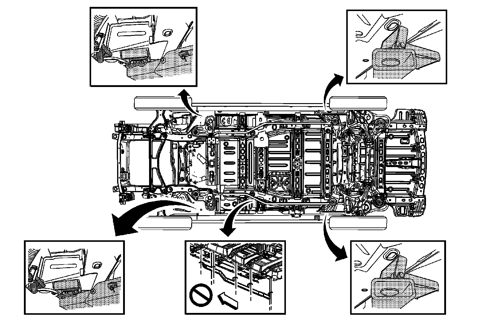 * Perform the vehicle lifting or jacking procedure only at the identified lift points. DO NOT allow the lifting equipment or jacking equipment to contact any other vehicle components.