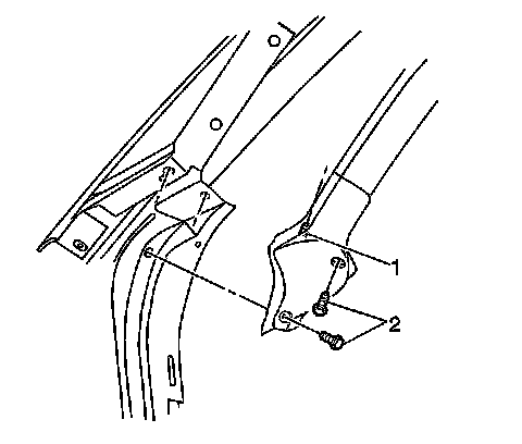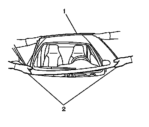 Note: The windshield lower supports (1) have molded in locks with an adhesive strip (2) on the back side. If the windshield lower stops have been removed, they must be replaced.