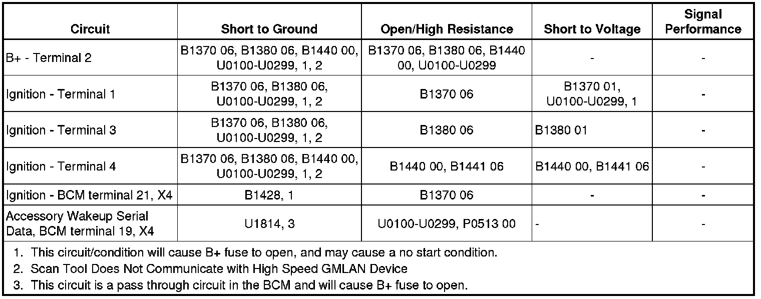 * BCM senses an open on the B+ circuit (to the ignition switch) while engine is running. An open on the B+ circuit can be caused by a short to ground on any of the following circuits: