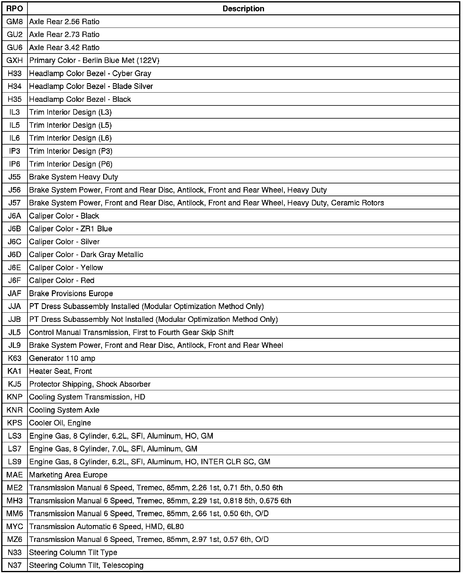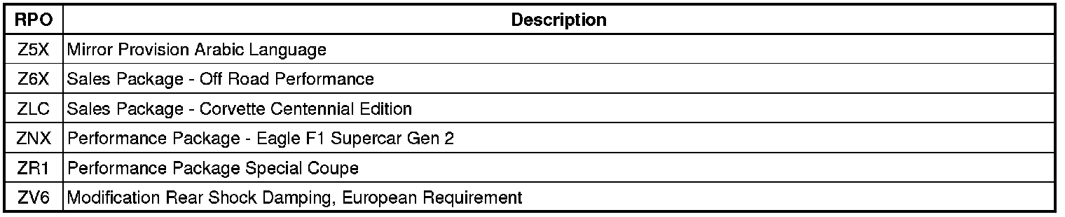 The following table provides the description of the Regular Production Option (RPO) codes that are available on the vehicle. The vehicle's RPO list is printed on the Service Parts Identification Label.