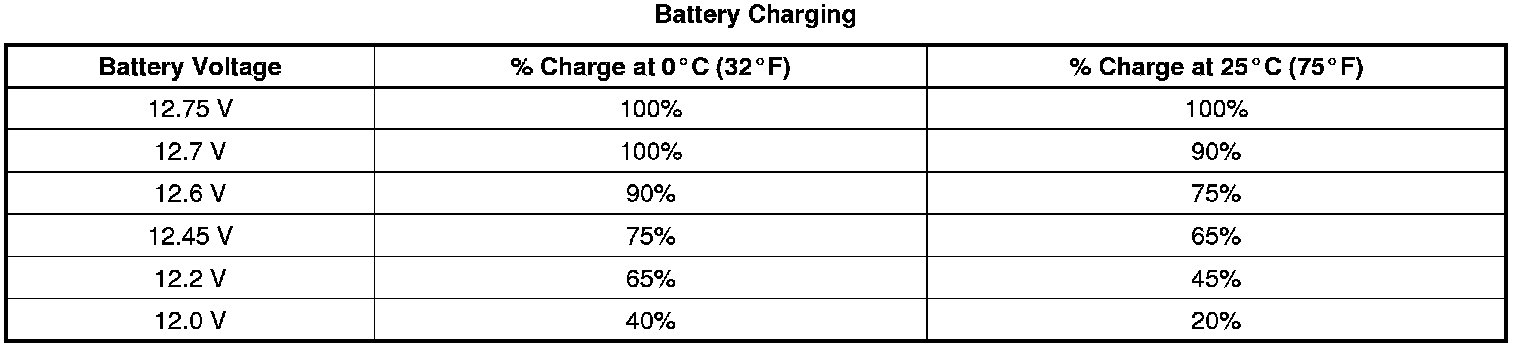 4. Measure the battery voltage at the battery terminals. Refer to the following table to determine the state of charge according to the estimated battery temperature: