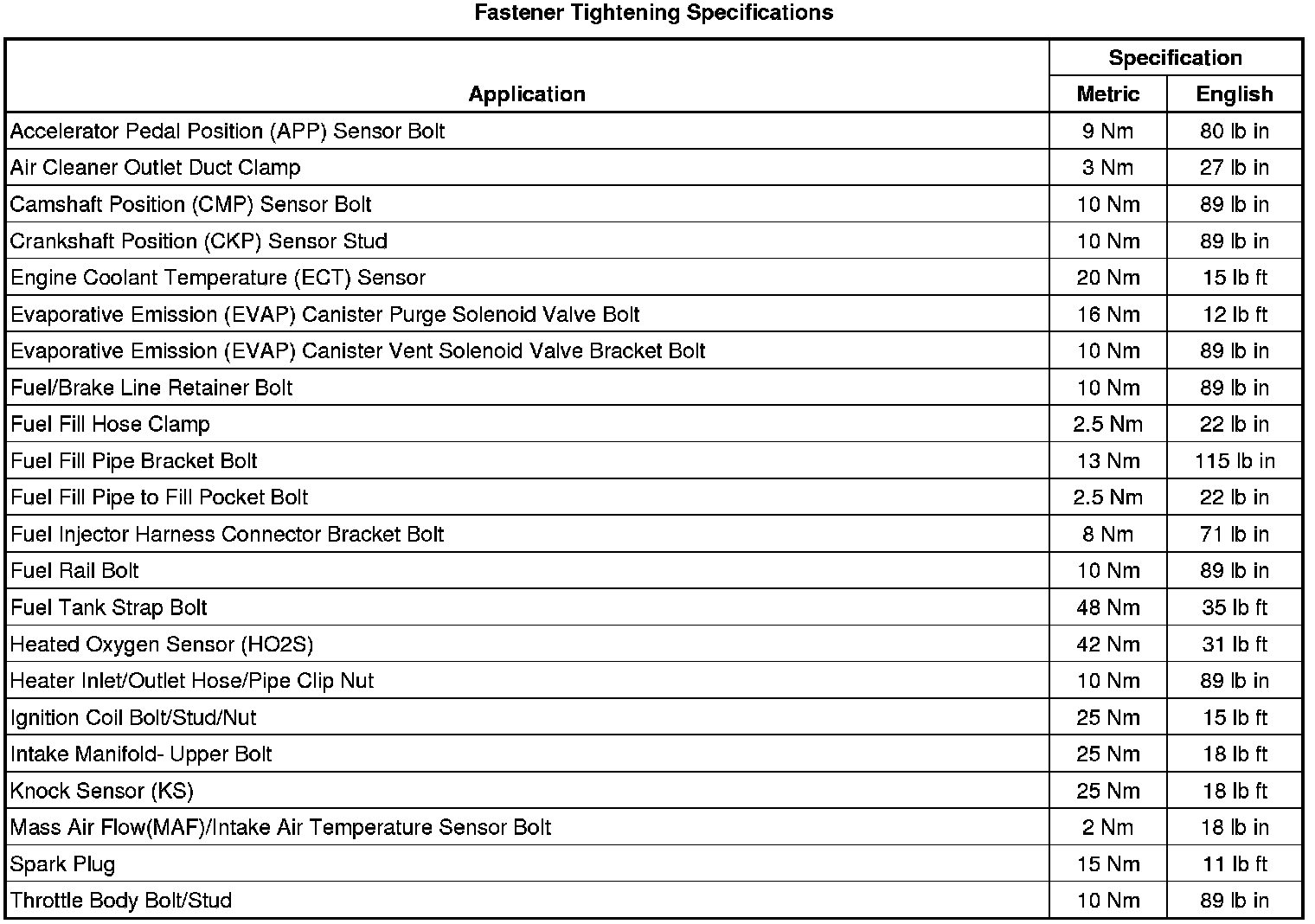 Fastener Tightening Specifications