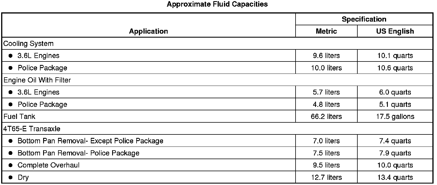 The following approximate capacities are given in US English and metric conversions. See Fluid and Lubricant Recommendations Maintenance for more information. All capacities are approximate. When adding, be sure to fill to the approximate level, as recommended in this manual. Recheck fluid level after filling.