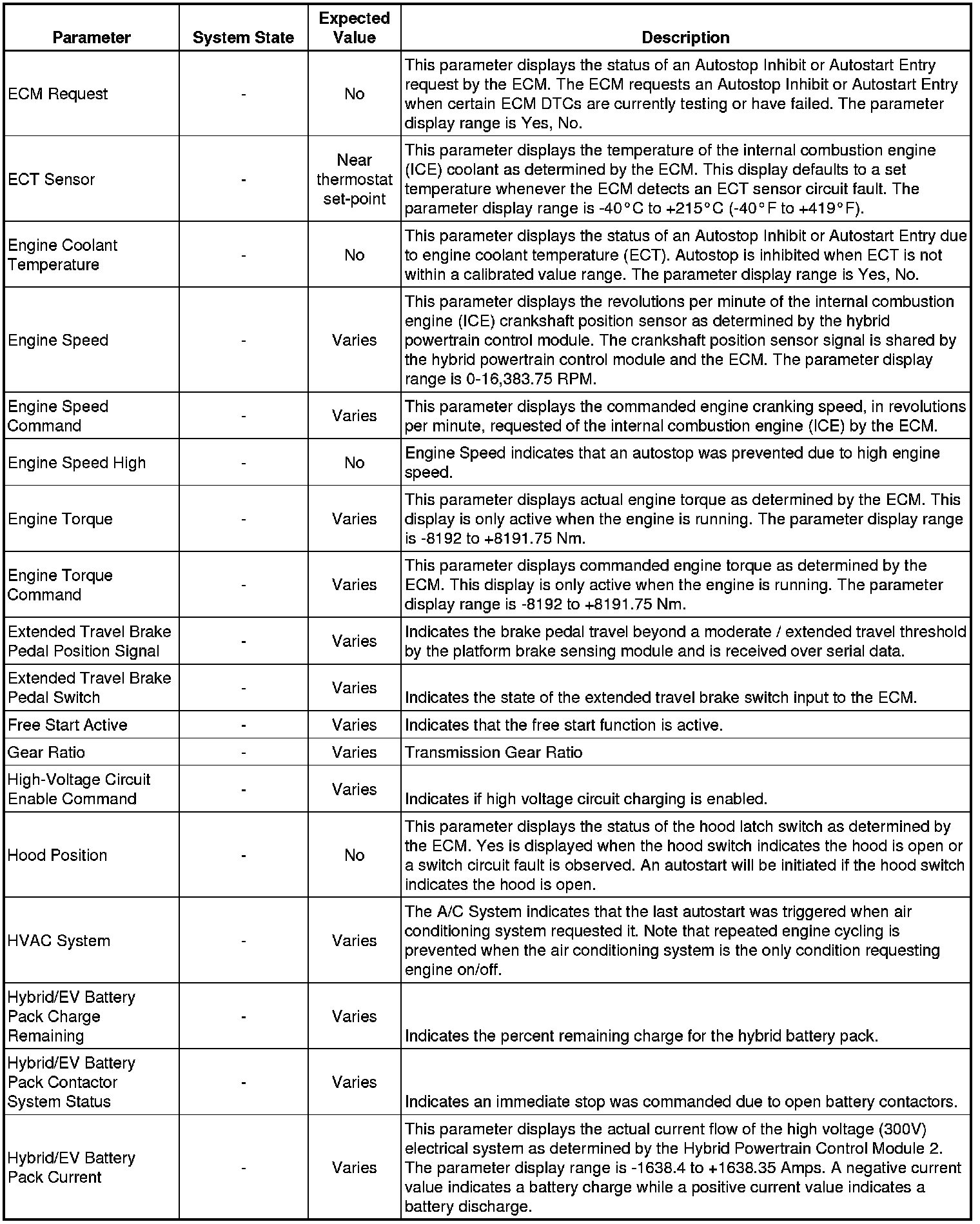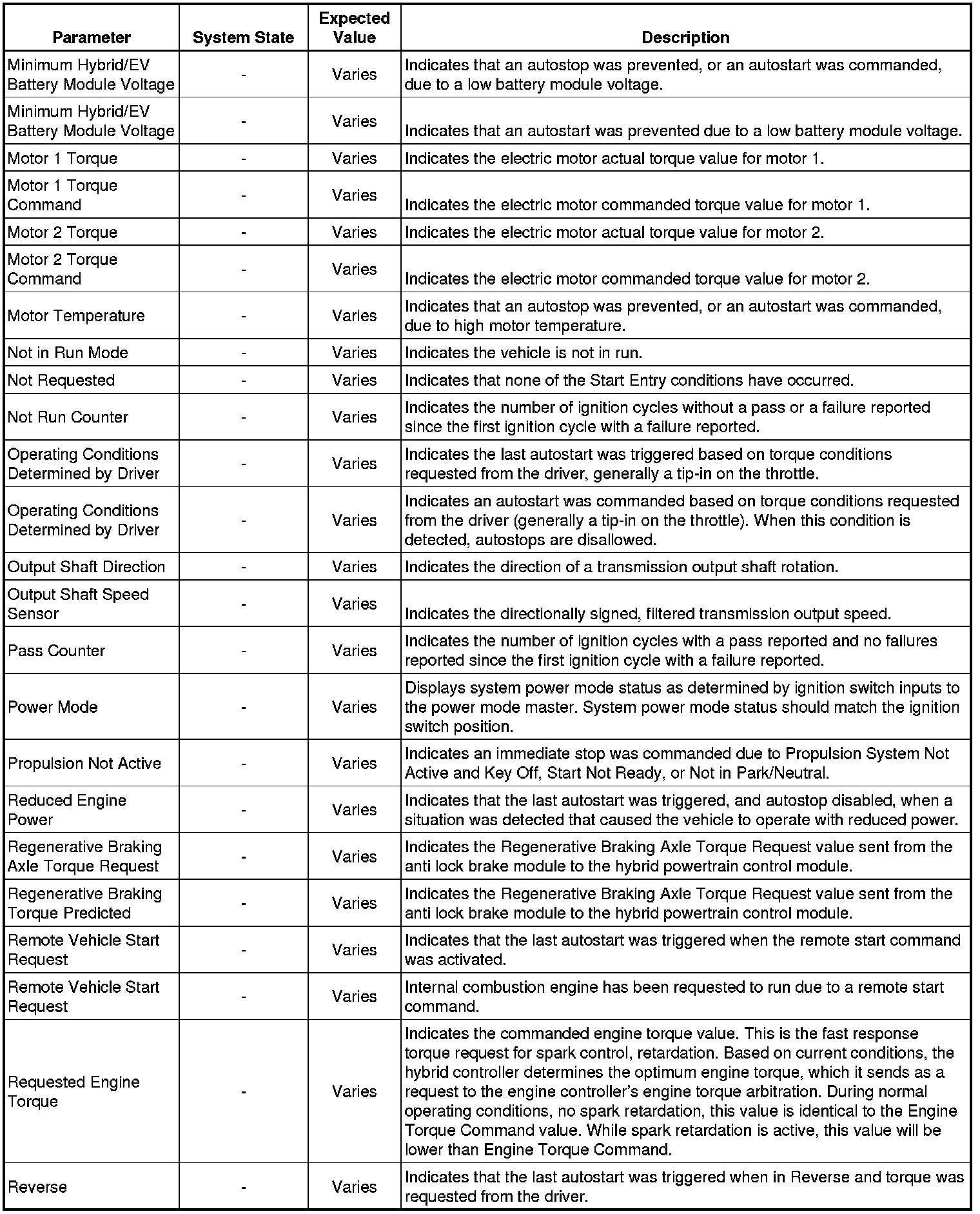 The scan tool values from a properly running vehicle may be used for comparison with the vehicle you are diagnosing. The Hybrid Powertrain Control Module Scan Tool Data Parameters list represents values that would be seen on a normally running vehicle.