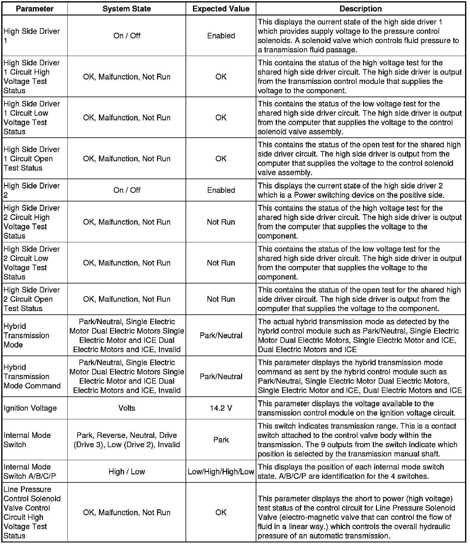The Transmission Control Module Scan Tool Data List contains all transmission related parameters that are available on the scan tool. The list is arranged in alphabetical order. A given parameter may appear in any one of the data lists, and in some cases may appear more than once, or in more than one data list in order to group certain related parameters together.