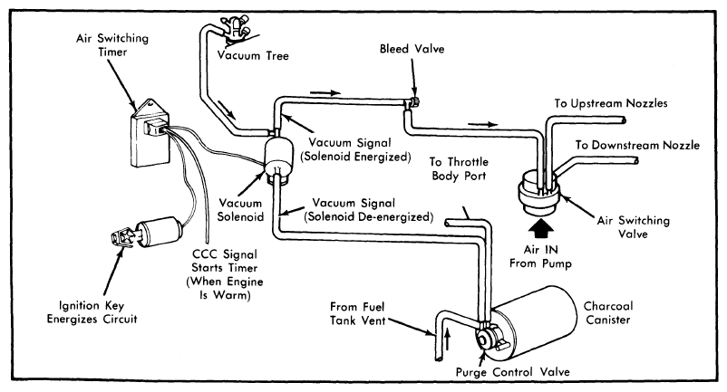 The ECS system operates in conjunction with the air switching system. When air injection is shifted downstream, the vacuum signal which keeps the canister purge valve closed is shut off. Engine vacuum draws vapors out of the canister and into the engine, where they are burned. When the engine is stopped, vapors again flow from the engine and fuel tank to the canister. See Figure.