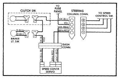 - Disconnect 4-wire connector at steering column. Connect a 12 volt positive source to terminal 3 in connector going to speed control switch. With switch in "ON" position, connect a test lamp between connector terminal 1 and ground. Lamp should light and then go out when speed set button is depressed. See Figure .