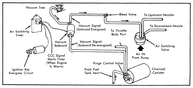 An air switching timer (on Firewall) is used by the CCC to provide air switching. As soon as the engine coolant sensor indicates to the computer that coolant is warm, it starts a 70 second timer. At the end of 70 seconds, a signal is sent to a vacuum solenoid, which allows vacuum to operate the air switching valve. Air is directed "downstream" to the converter. If the engine is warm when started, the 70 second timer is started immediately. See Figure.