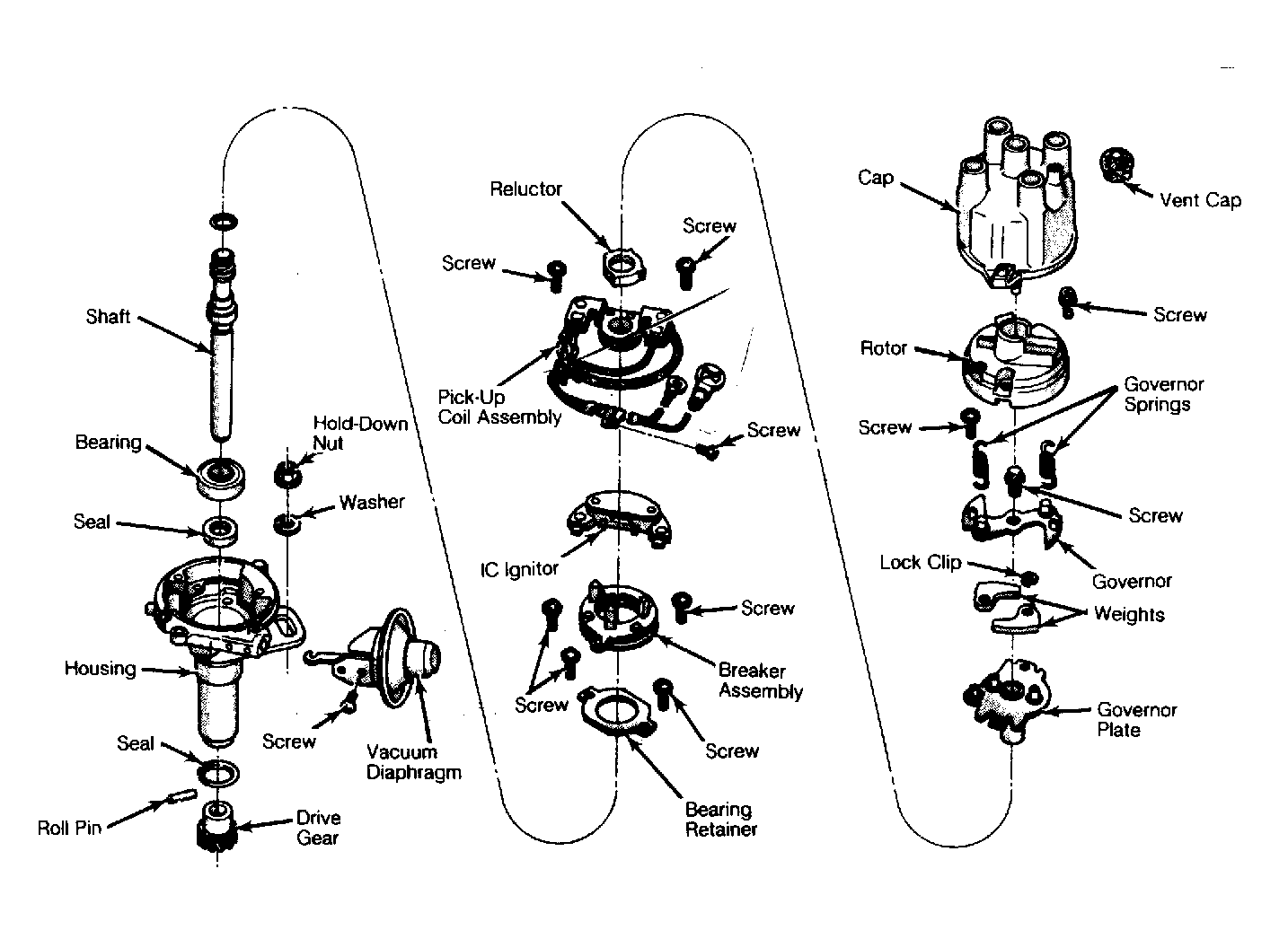 - Remove 2 screws securing vacuum diaphragm assembly. Disengage vacuum diaphragm from breaker assembly. Remove 2 screws retaining breaker assembly, and lift assembly from distributor housing.