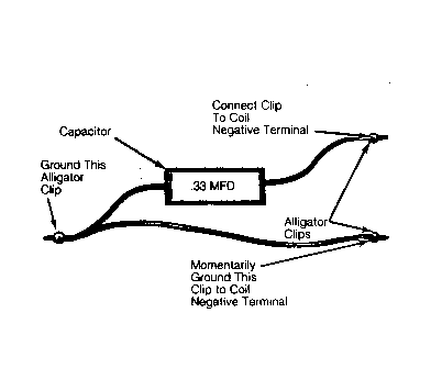 - If battery voltage was indicated in step 4, hold coil secondary wire about 3/8" from a good ground. Using a special jumper wire assembly, momentarily touch ignition coil negative terminal to ground See Fig 2 . A spark should result.
