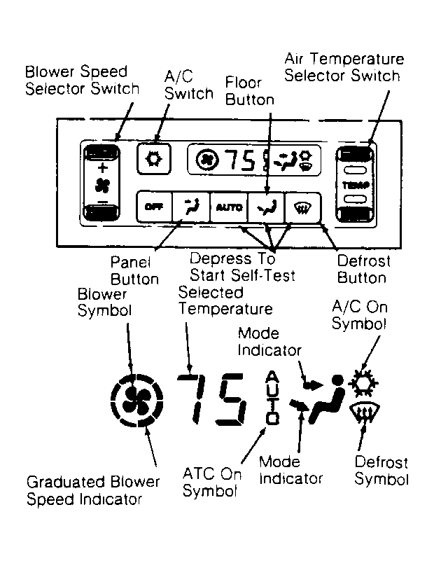 Control panel allows operator to control various functions of ATC control module by pushing buttons to change system modes. See Fig 1. Blower speed, selected temperature, airflow direction and A/C mode is displayed on control panel. To change temperature display reading from Fahrenheit to Celsius or vice versa, depress floor and defrost buttons at the same time.