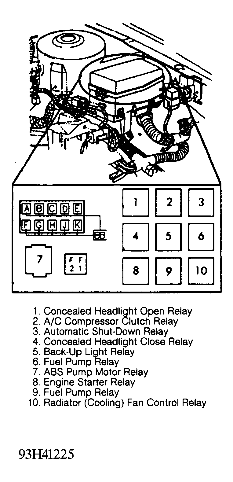 - If voltage is less than 10 volts, remove and inspect fuse "E" from power distribution center. See Figure . Power distribution center is located in engine compartment, near left shock tower. If fuse is blown, go tostep 6). If fuse is okay, check voltage of Black wire (power distribution cavity) of fuse "E".