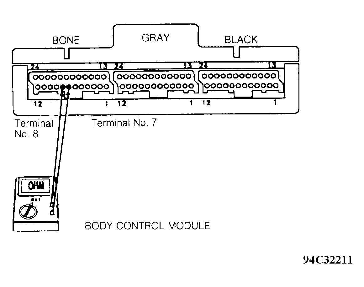 - Using an external ohmmeter, check resistance between BCM terminals No. 7 and 8. See Fig 1 . If resistance is not 100-140 ohms, replace BCM.