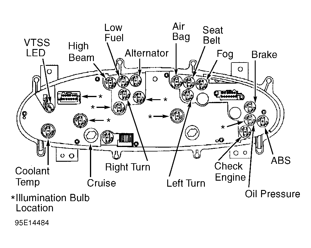 - Turn ignition off. Disconnect instrument cluster. Ensure connectors are clean and not damaged. See Figure in INSTRUMENT CLUSTER TEST 8A. Remove and inspect check engine light bulb. Ensure bulb socket is clean and not damaged. If bulb is defective, replace bulb. If bulb is okay, repair or replace instrument cluster as necessary.