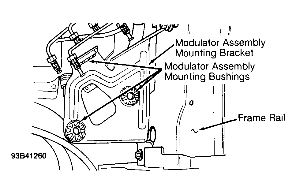 - Check 3 modulator assembly bushings and replace if necessary. See Fig 1. Install modulator assembly on mounting bracket. Ensure bushings are properly aligned on mounting bracket and modulator assembly. Install, but DO NOT tighten, modulator assembly-to-bracket bolt. Raise vehicle on hoist. Install and tighten both lower mounting bracket bolts to 21 ft. lbs. (28 N.m).