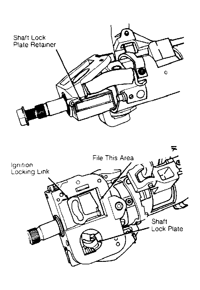 remove shaft lock plate retainer, shaft lock plate, or ignition locking link. See Fig 1.