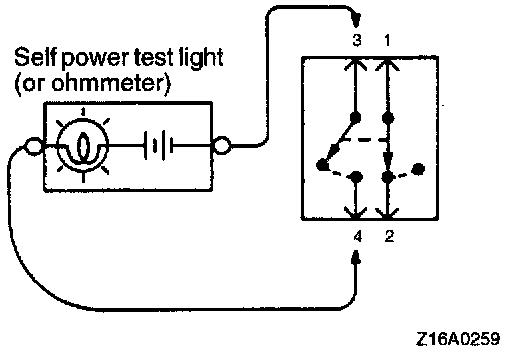 b. When the switch is in the ON position, the self power test light should come on or the ohmmeter should read 0 Ohm only when the terminals 3 and 4 are interconnected.