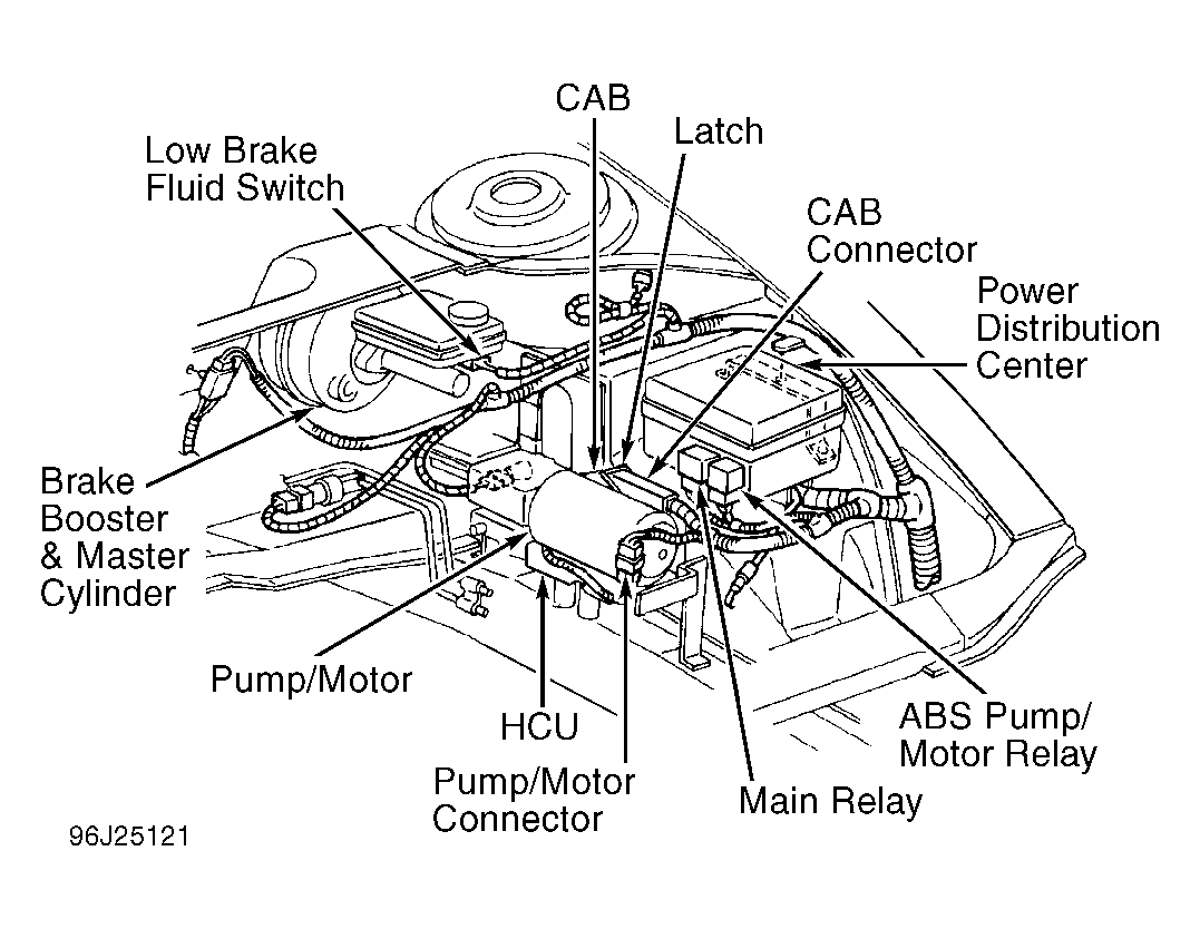 The Teves-Mark IV-G ABS may be equipped with a Low Speed Traction Control System (LTCS) which prevents front wheel slippage during fast acceleration at speeds less than 30 MPH. The ABS consists of Controller Anti-Lock Brake (CAB), Hydraulic Control Unit (HCU), brake booster and master cylinder, low brake fluid switch, ABS main relay and pump/motor relay. See Fig 1 . ABS also uses a brakelight switch, 2 proportioning valves and 4 wheel speed sensors.