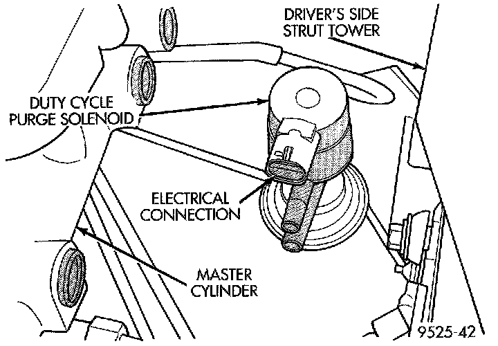 The duty cycle EVAP purge solenoid regulates the rate of vapor flow from the EVAP canister to the throttle body. The powertrain control module operates the solenoid.