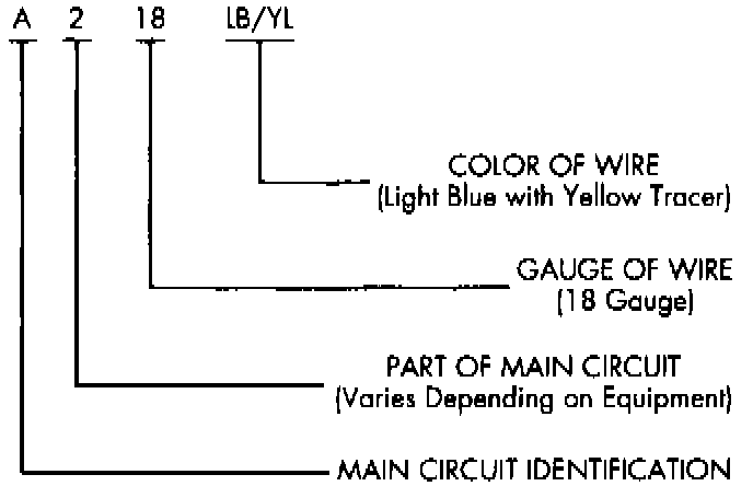 Each wire shown in the diagrams contains a code which identifies the main circuit, part of the main circuit, gauge of wire and color. The color is shown as a two-letter code, which can be identified by referring to the Wire Color Code chart.