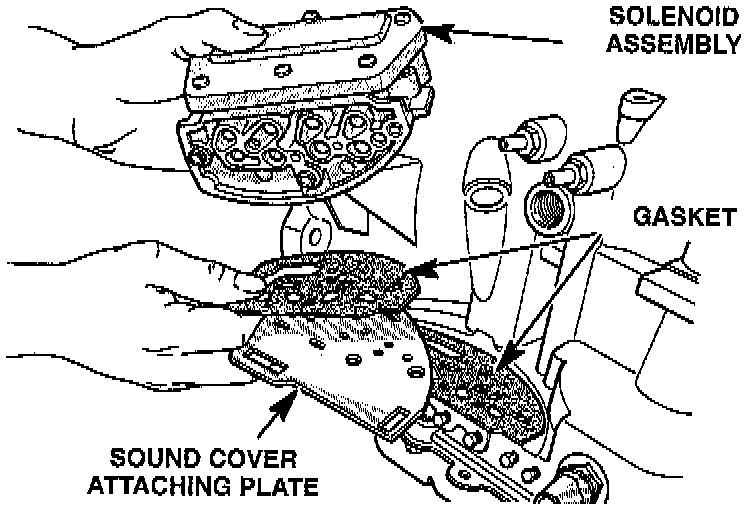 The assembly is mounted to the outside of the transaxle case, under a sound shield protective cover, toward the front of the vehicle. There are two gaskets that seal the solenoid pack to the steel plate. There are also small solenoid valve filters used to protect the valves from contamination. These filters are not replaceable. If the valve body and solenoid pack have been heavily contaminated, the solenoid pack should be closely inspected to determine if it should be replaced. The solenoid pack is not a serviceable unit.