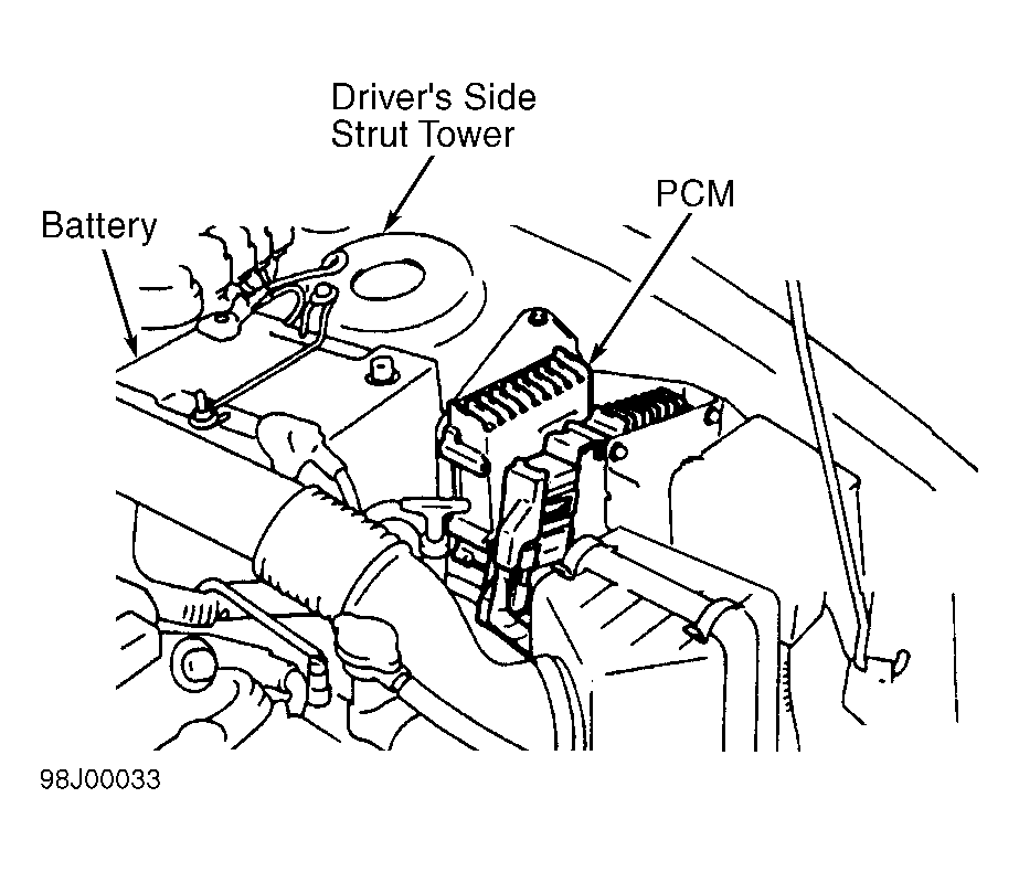Powertrain Control Module (PCM) is located at driver's side front corner of engine compartment. See Fig 1 . Service information is not available from manufacturer.