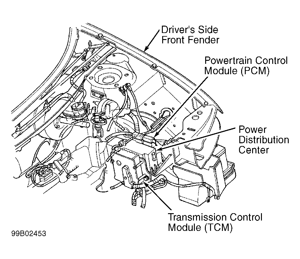 Powertrain Control Module (PCM) is located at driver's side front corner of engine compartment, just below air cleaner assembly. See Fig 1. If replacing the PCM, the PCM must be properly programmed. See POWERTRAIN CONTROL MODULE PROGRAMMING .