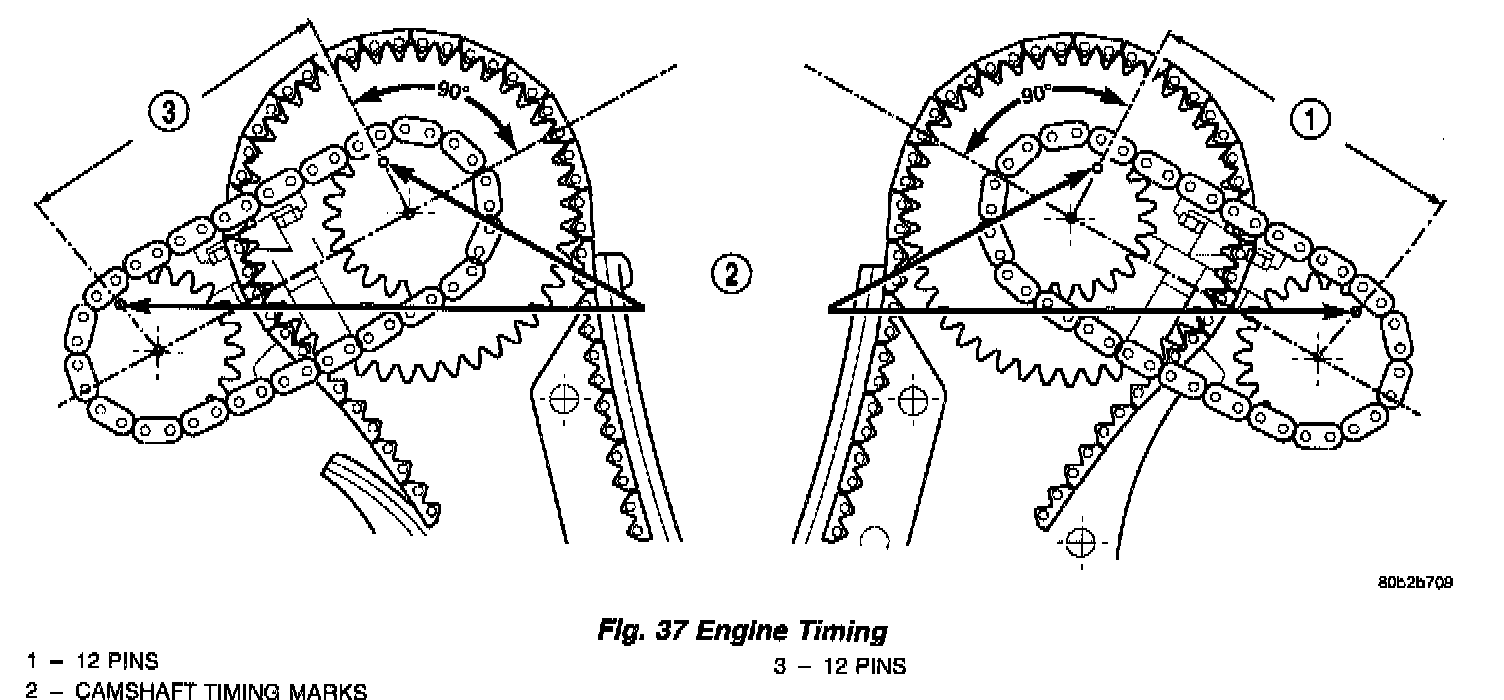 4. Count chain pins from the mark on the intake camshaft towards the exhaust camshaft. Engine is timed correctly when there are 12 chain pins between the timing marks on the intake camshaft and exhaust camshaft (Fig. 37).