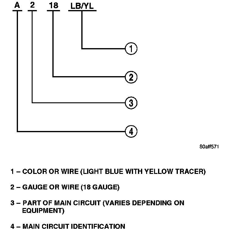 Each wire shown in the diagrams contains a code which identifies the main circuit, part of the main circuit, gauge of wire, and color.