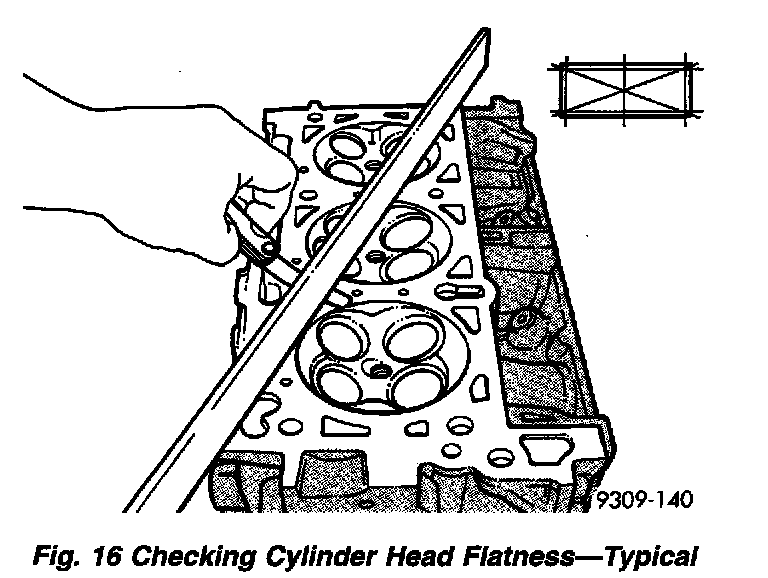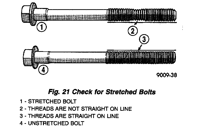 The cylinder head bolts are tightened using a torque plus angle procedure. The bolts must be examined BEFORE reuse. If the threads are necked down the bolts must be replaced. Necking can be checked by holding a straight edge against the threads. If all the threads do not contact the scale, the bolt must be replaced.