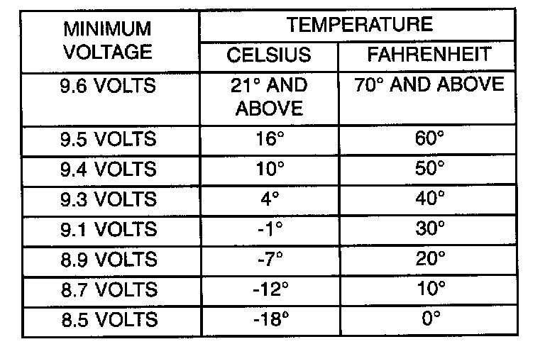 5. Voltage drop will vary according to battery temperature at the time of the load test. Battery temperature can be estimated by the temperature of exposure over the preceding several hours. If the battery has been charged or boosted a few minutes prior to the test, the battery would be slightly warmer. Refer to Load Test Temperature Chart for proper loaded voltage reading.