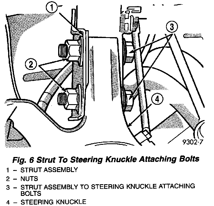 CAUTION: When removing the strut to knuckle bolts from the strut clevis bracket, do not allow knuckle to pull away, putting a strain on the brake flex hose. The bolts attaching the strut to the steering knuckle are serrated in the area where they go through the steering knuckle and strut. When removing, do not turn the bolts in the steering knuckle. If bolts are turned in the steering knuckle, damage to the steering knuckle will result.