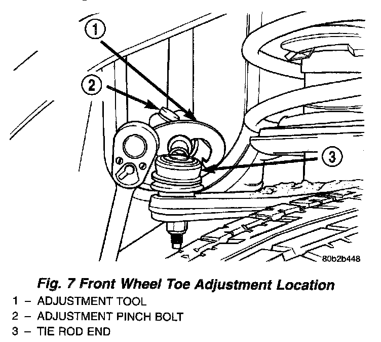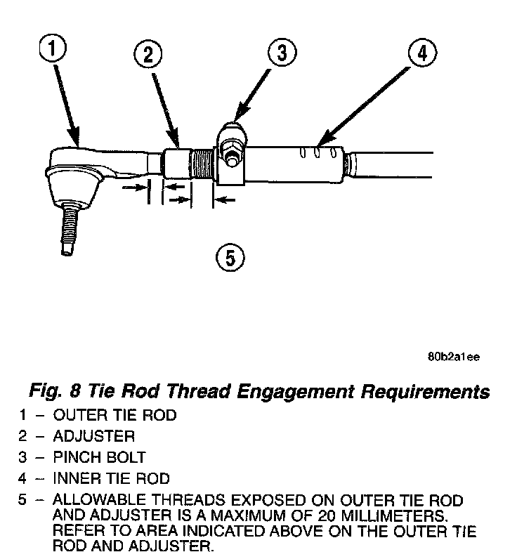 CAUTION: When setting toe on vehicle, the maximum dimension of exposed threads allowed on inner and outer tie rod cannot exceed the distance shown. If the maximum distance is exceeded, inadequate retention of either inner or outer tie rod may result. Ensure that adjustment pinch bolt is torqued to required specification when Toe setting procedure is completed. When torquing adjustment pinch bolt, the following procedure must be followed to ensure adequate retention of the adjustment sleeve. Not following this procedure, could result in the Toe Setting Adjustment changing and/or loosening of the inner or outer tie rod ends.