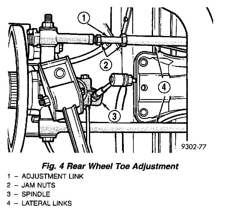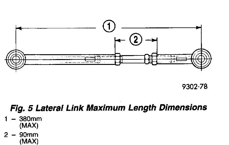 1. Loosen lateral link, adjustment link jam nuts. Rotate adjustment links as required to set rear wheel Toe to specifications. Do not exceed the maximum length dimensions of the lateral links shown in. Both dimensions must be checked to ensure they do not exceed maximums allowed.