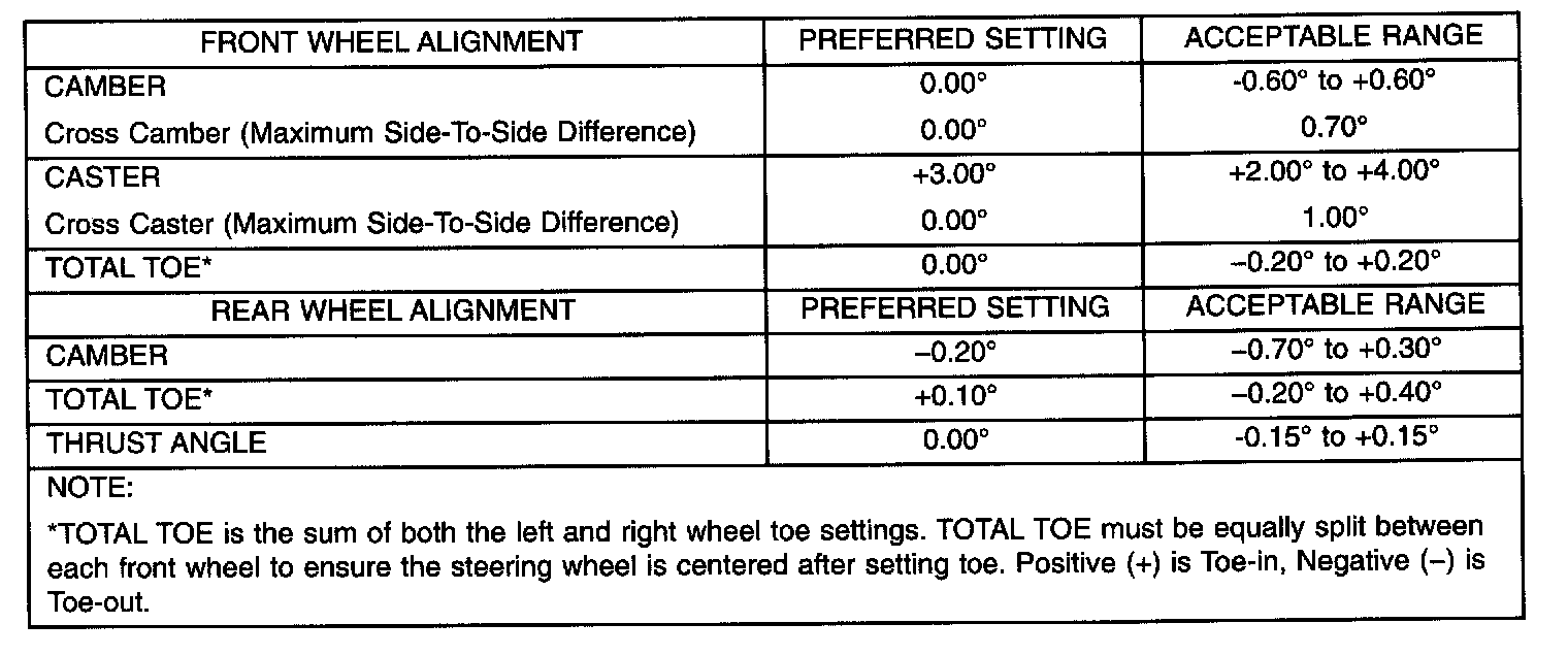 All specifications are given in degrees. All wheel alignments are to be set with the vehicle at curb height. Refer to CURB HEIGHT MEASUREMENT in SERVICE PROCEDURES.