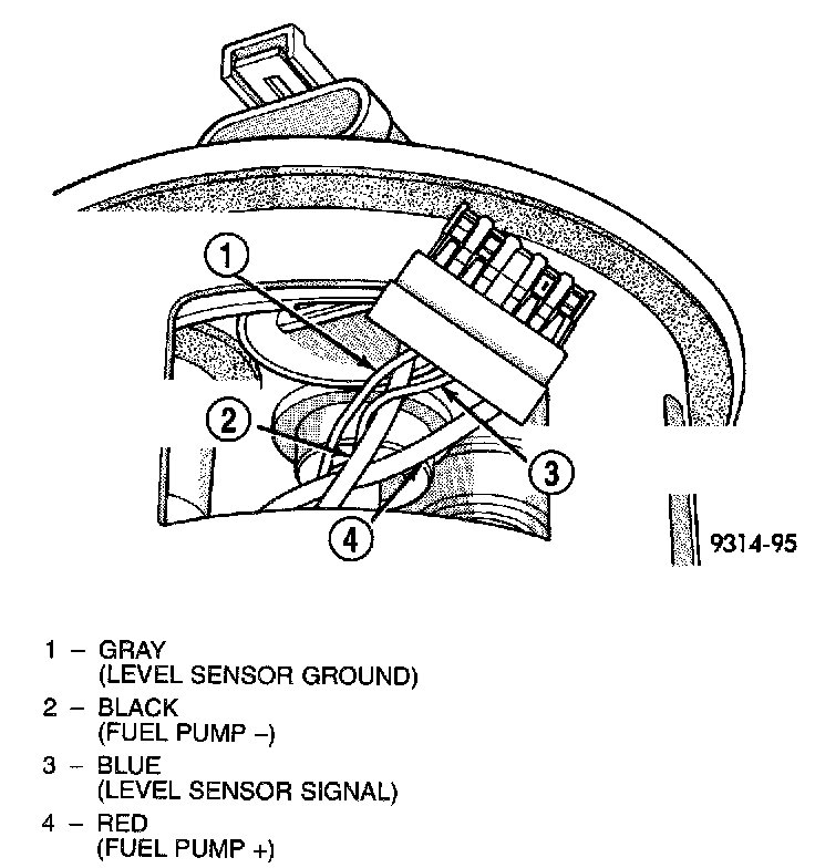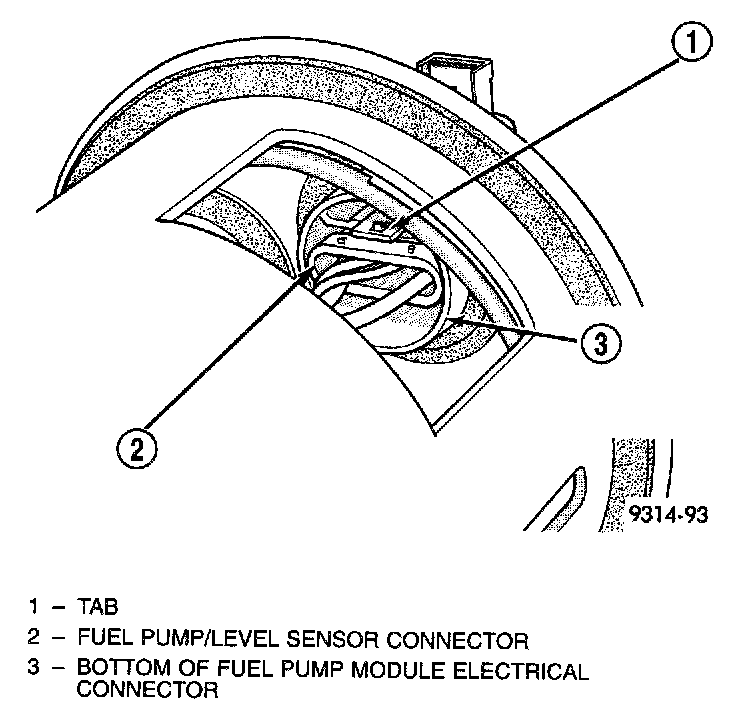 1. Depress the retaining tab and remove the fuel pump/level sensor connector from the bottom of the fuel pump module electrical connector.