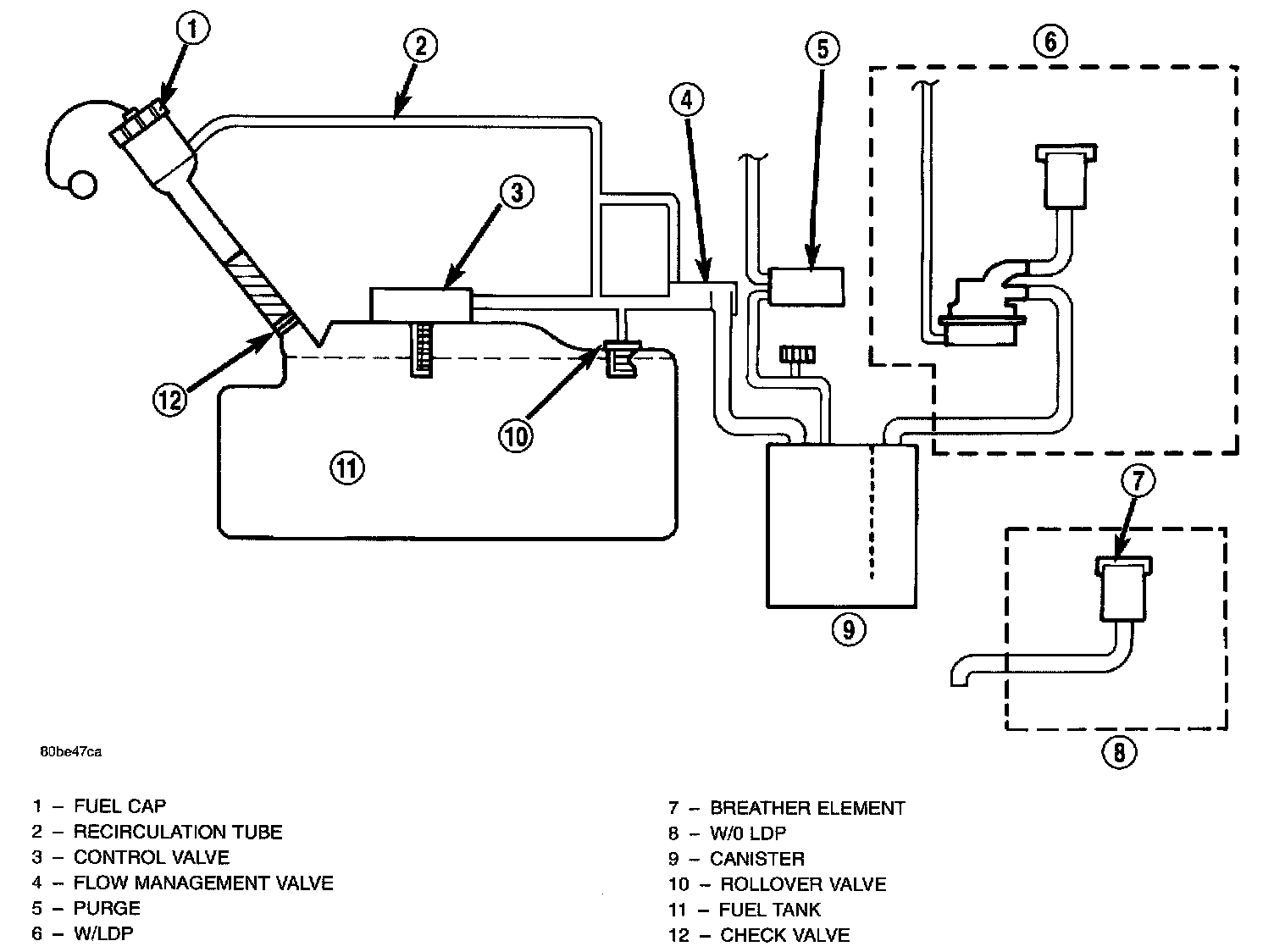 The evaporation control system prevents the emission of fuel tank vapors into the atmosphere. When fuel evaporates in the fuel tank, the vapors pass through vent hoses or tubes to an activated carbon filled evaporative canister. The canister temporarily holds the vapors. The Powertrain Control Module (PCM) allows intake manifold vacuum to draw vapors into the combustion chambers during certain operating conditions.