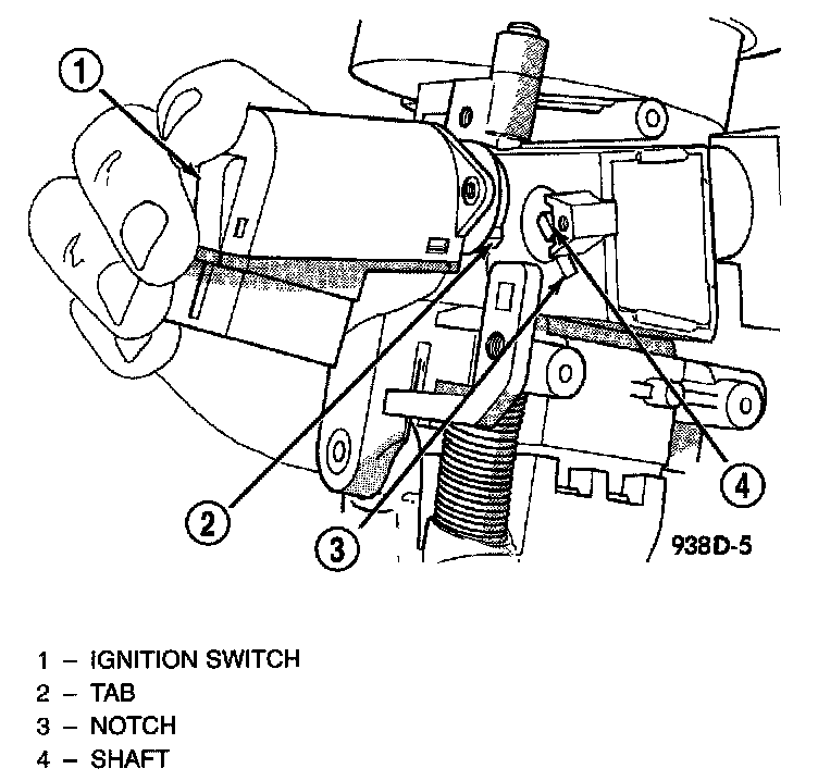 1. A tab on the ignition switch indexes to a notch in the lock cylinder housing. Also, a slot in the end of the ignition switch fits over the shaft in the end of the lock cylinder housing. Use the ignition key to rotate the lock cylinder to align the ignition switch with lock cylinder housing.