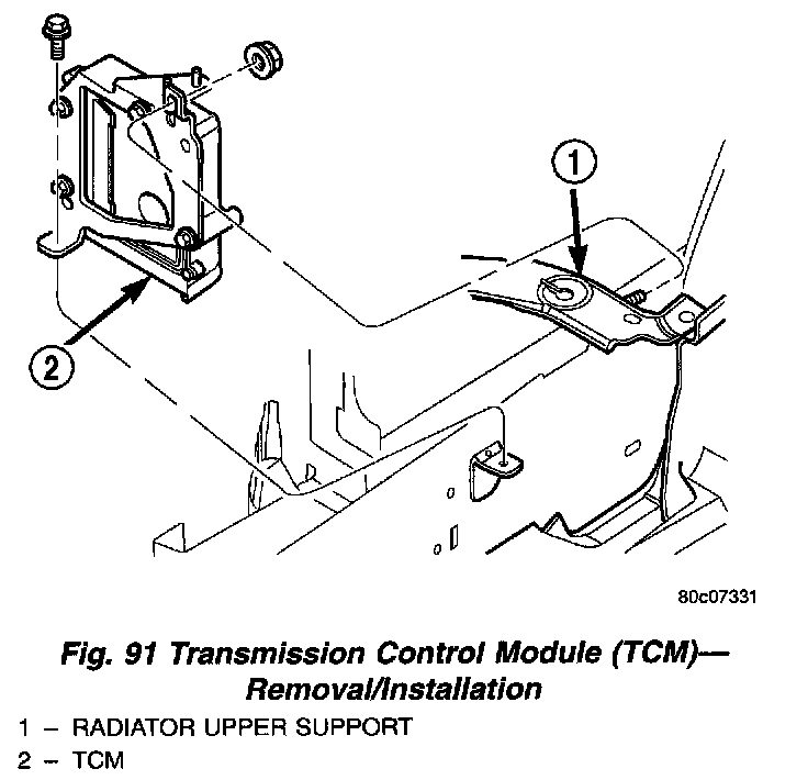 6. Remove transmission control module mounting screws and lift module from vehicle (Fig. 91).