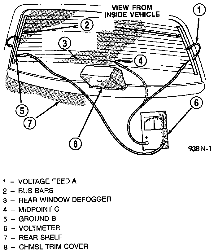 3. Touch the positive bus bar and check voltage. The voltage should be above 11 volts. Push the Rear Window Defogger button to turn off the indicator. The measured voltage should be 0 volts. If these voltages are correct then the problem is with the Rear Window Grid or Grid ground electrical connection. Go to the Grid Lines test to check the Grid and ground connection. If there is no voltage to the rear window defogger grid when the system is ON, then go to the Fuse and Electrical Short Test.