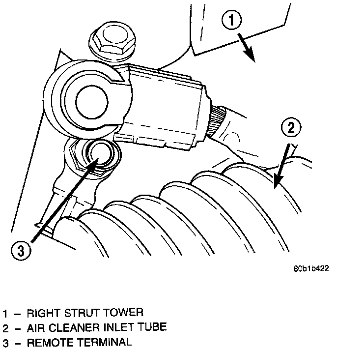 1. Open hood and disconnect the negative battery cable remote terminal from the remote battery post.